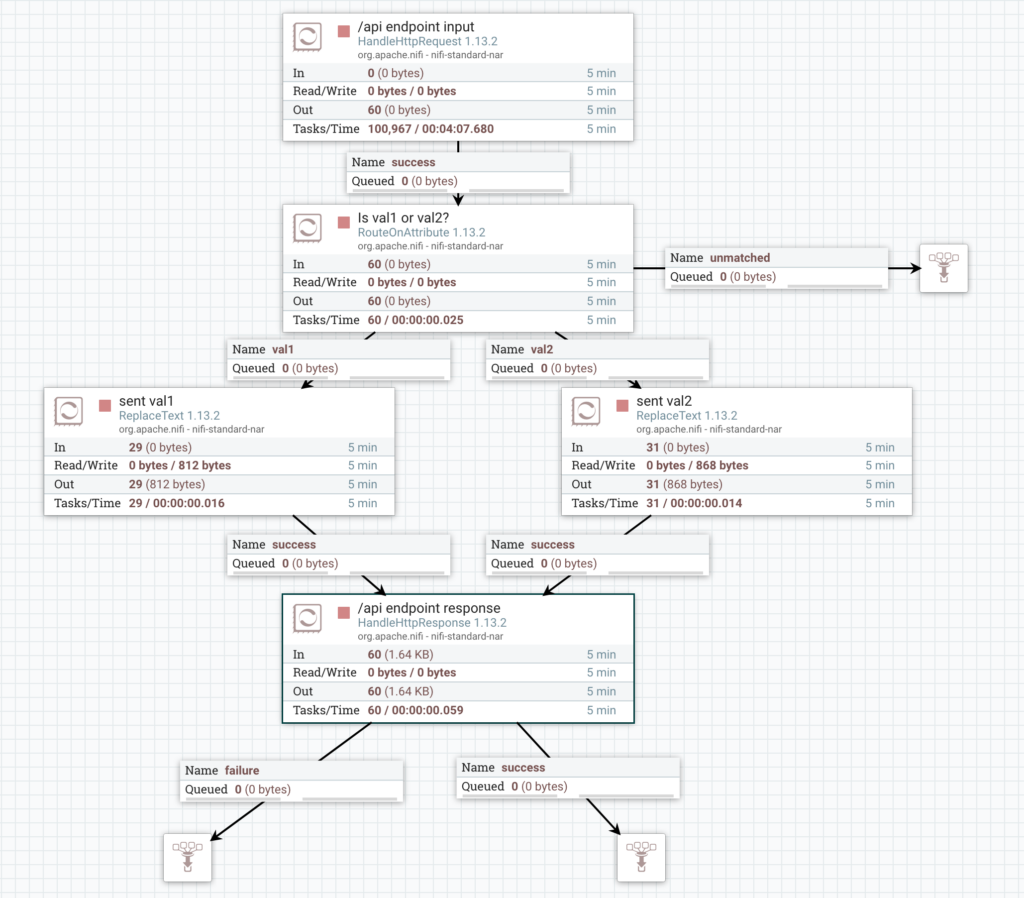 The API that I created in NiFi in NiFi is very simple and I will discuss building it in a different post. At a high level, it is listening on /api and looking for the param1 URL parameter. It checks to see whether param1 value is either val1 or val2. It returns a JSON response telling you which value was sent. E.g. for val1 it will send: