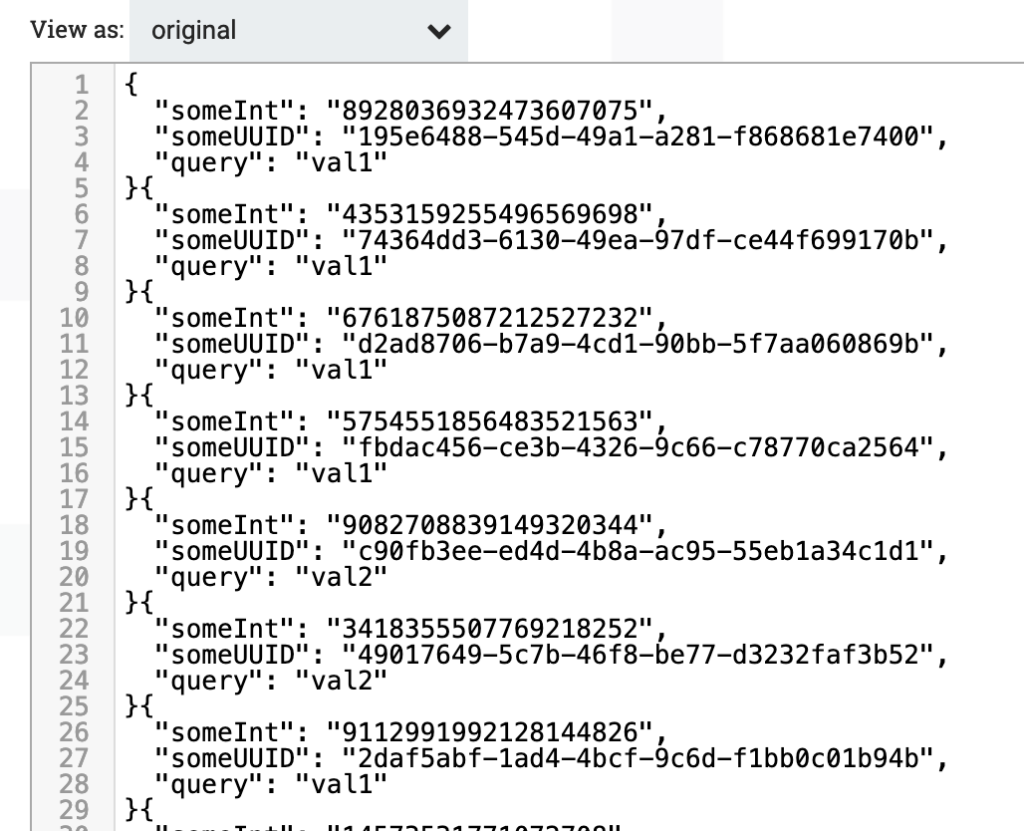 Where someInt is a random number, someUUID is a random UUID string and query is one of either val1 or val2.