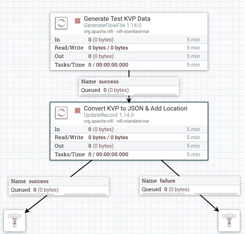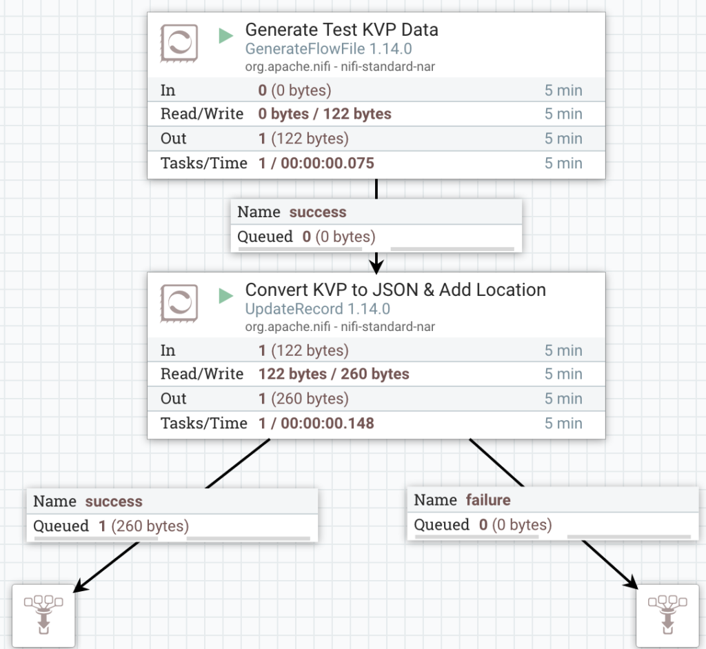 You should now be able to start both the GenerateFlowFile and UpdateRecord Processors. A FlowFile should end up in the Success queue, containing a JSON representation of our test data plus the additional location field.
