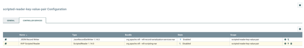 Save this config, and enable both the ScriptedReader and JsonRecordSetWriter by clicking the Enable button.