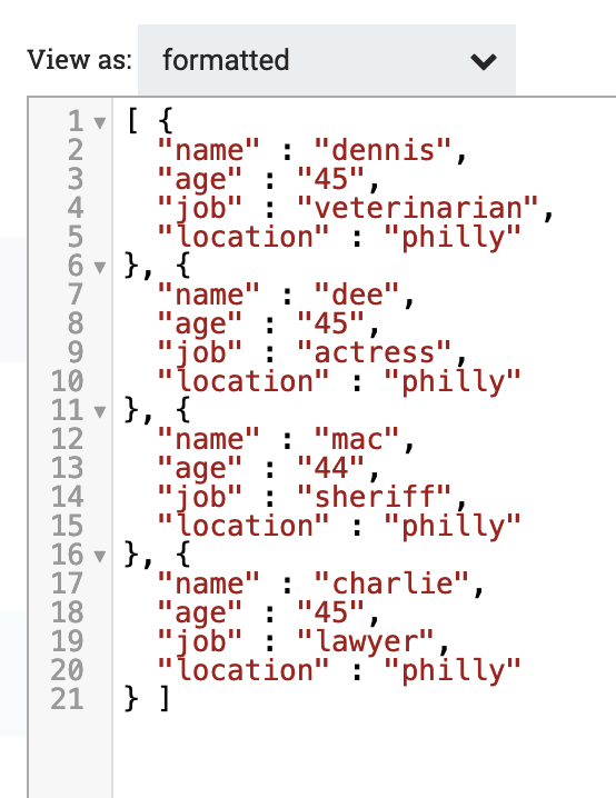 [name:dennis, age:45, job:veterinarian], [name:dee, age:45, job:actress],