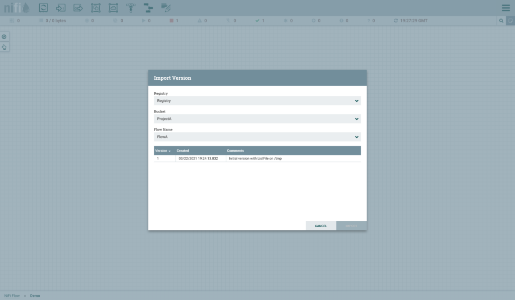 We can pick the Registry client and Bucket we want to import flows from. Then we can pick the Flow to import. Then we are given a list of the available version to choose from. We only have 1 version - you need to click the row in the list.