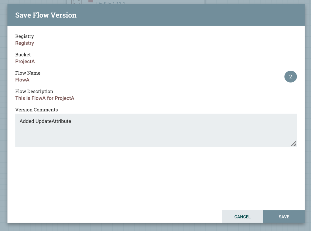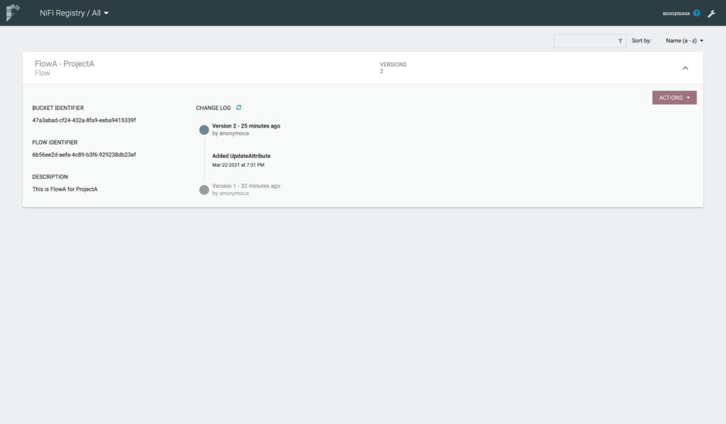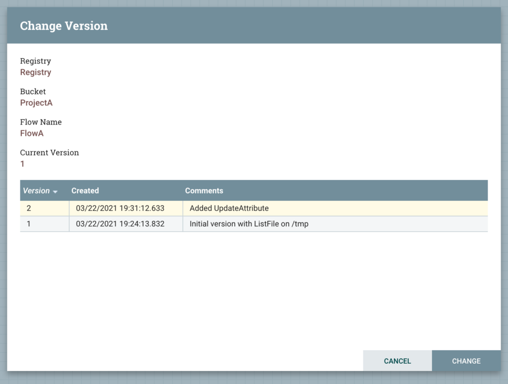 Back in NiFi Registry, we can see that our flow has another version.
