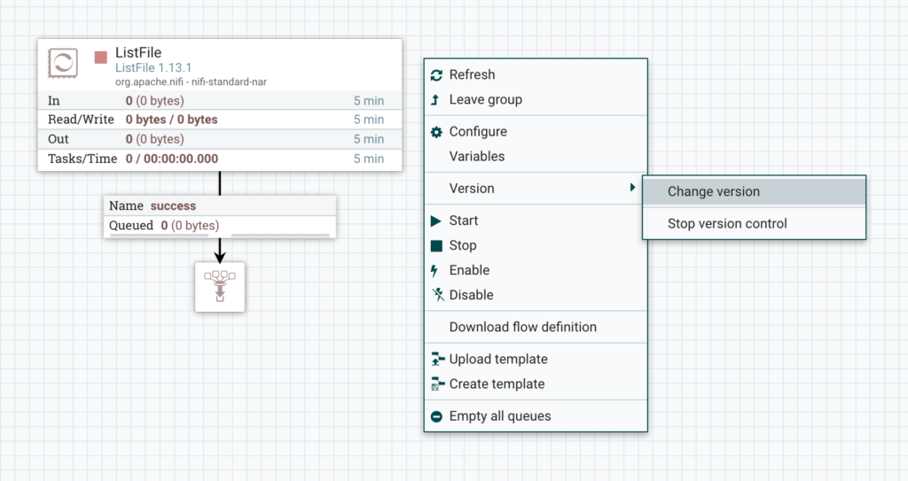Inside the process group, we can see the flow is still the original version. To upgrade, we can right click the canvas background, go to Version and then Change Version.