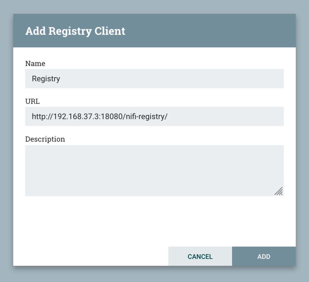 We get a dialogue box to enter the registry details. Add the URL for your NiFi Registry instance - just copy the URL from the browser, including the http:// prefix, hostname, port, and the /nifi-registry/ suffix. Provide a name that identifies your Registry client - you can have more than one NiFi Registry so this lets us indentify which Registry we are using when we version a flow. The description is optional.