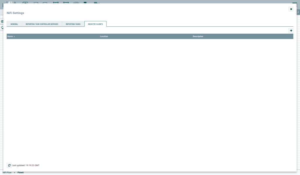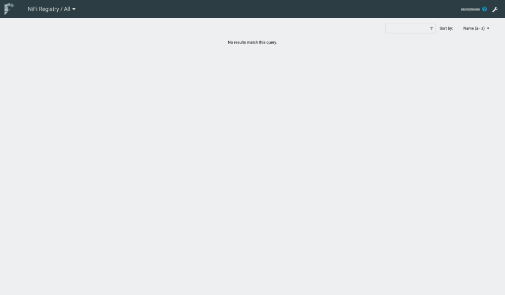 Firstly, we see a blank registry with no buckets or flows. We click the Spanner icon in the top right.