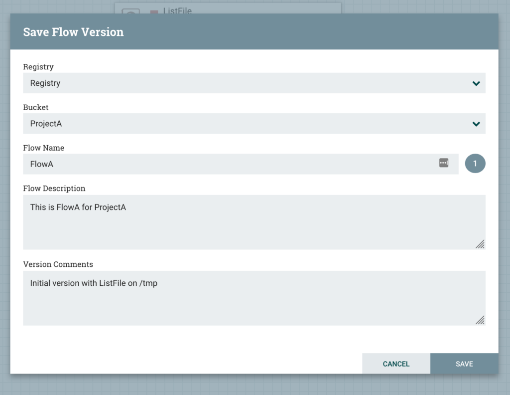 We get a dialogue box to provide details. Select the Registy client and the Bucket we created earlier. Provide a name for the saved flow. A description can be given to describe the flow, and this is not changed between versions. You can also provide Version Comments, similar to a commit message, which can be given with each new version.