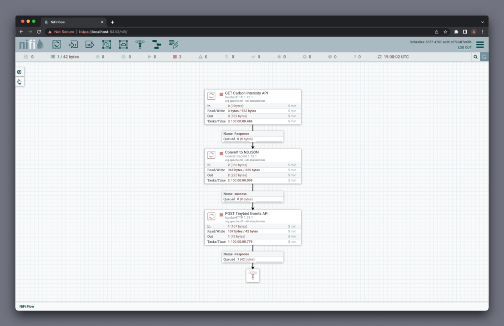The rest of your flow! There’s a few posts on my blog about building flows with NiFi, as well as links to other great NiFi resources here. I recently did a live stream about using Tinybird to build REST APIs over your Kafka streams, where I used a small Python script to pull data from the National Grid’s Carbon Intensity API and send it to Kafka. You could rebuild my Python script very easily in NiFi.