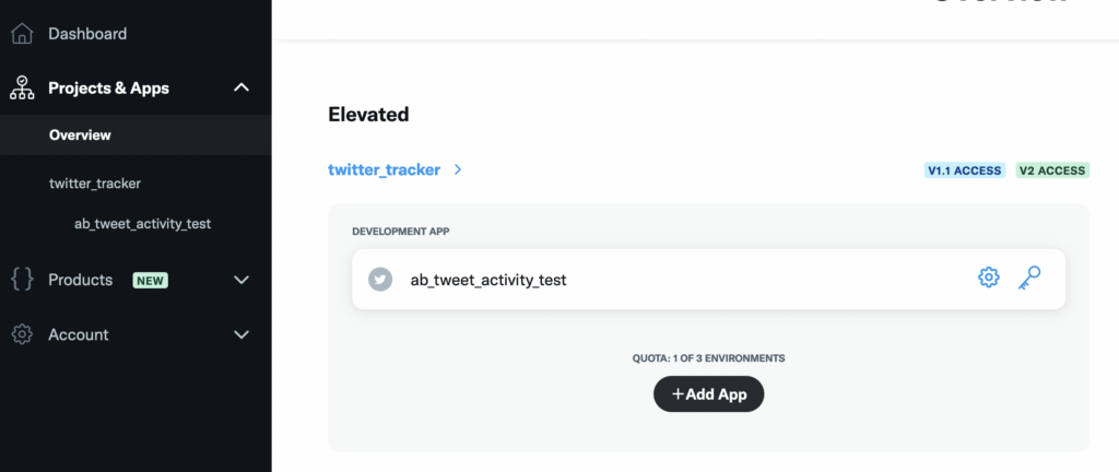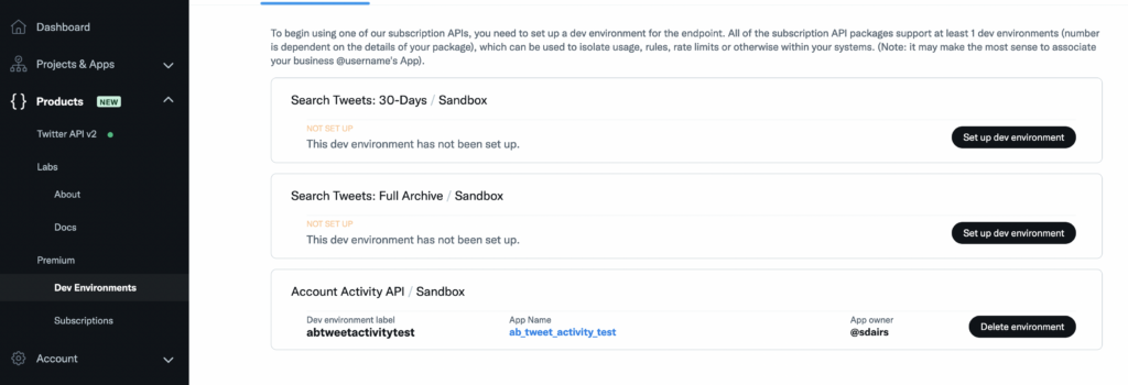 Next, you need to setup the Twitter development environment. In the Developer Portal side menu, go to Products > Premium > Dev Environments and find the Account Activity API / Sandbox at the bottom of the page, click the Set up dev environment button. Pick a unique label (name) for the env, and select the App you created from the drop down.