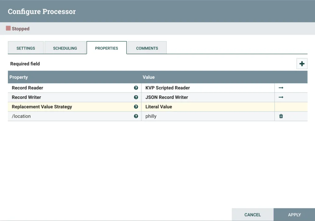 After this, add an UpdateRecord processor, then configure the Properties tab as follows: