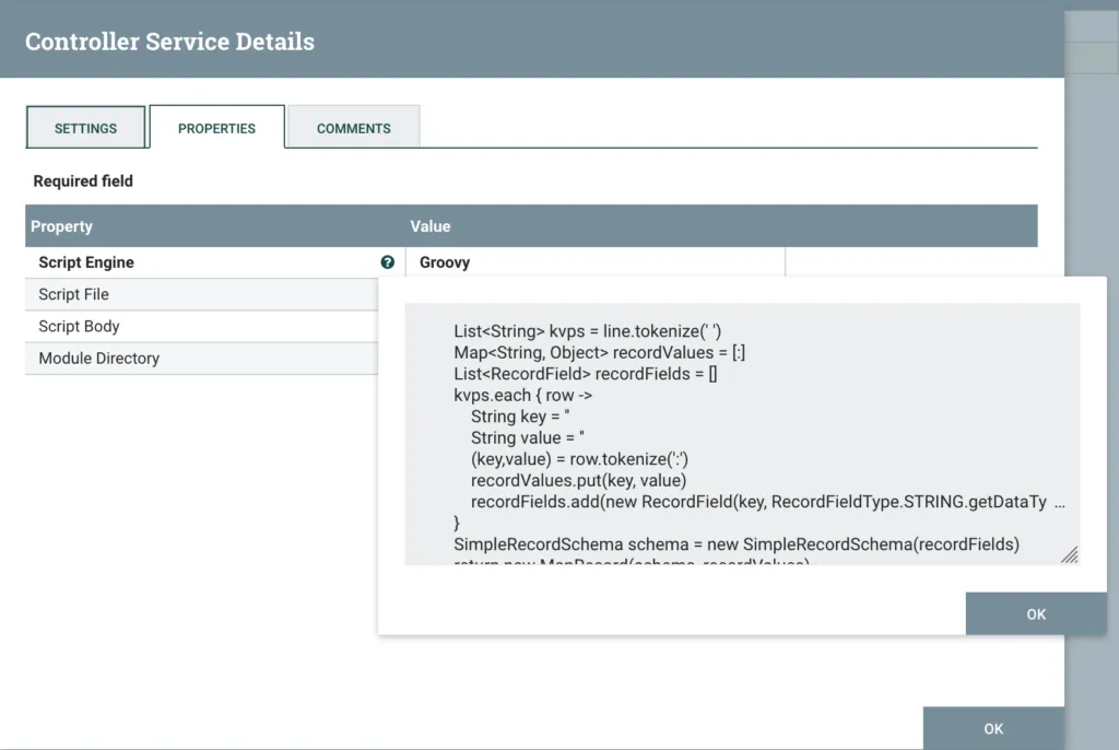 Return to the NiFi flow and enter the configuration for the ScriptedReader called KVP Record Reader. Copy the complete script and paste it into the Scipt Body property. Ensure that Script Engine is set to Groovy.
