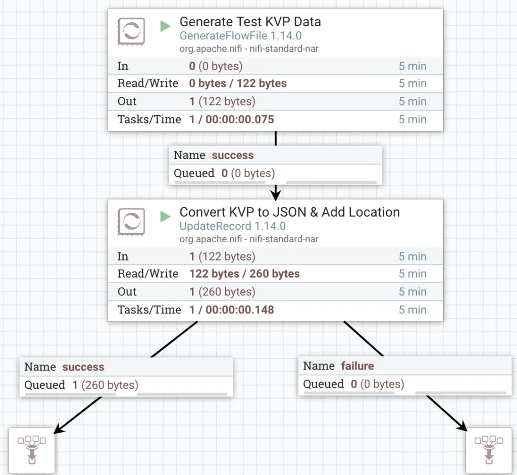 You should now be able to start both the GenerateFlowFile and UpdateRecord Processors. A FlowFile should end up in the Success queue, containing a JSON representation of our test data plus the additional location field.