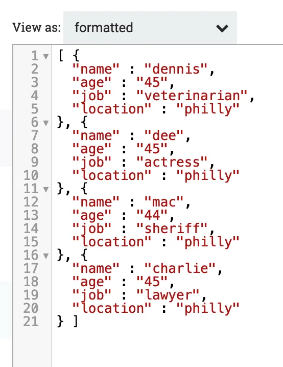[name:dennis, age:45, job:veterinarian], [name:dee, age:45, job:actress],